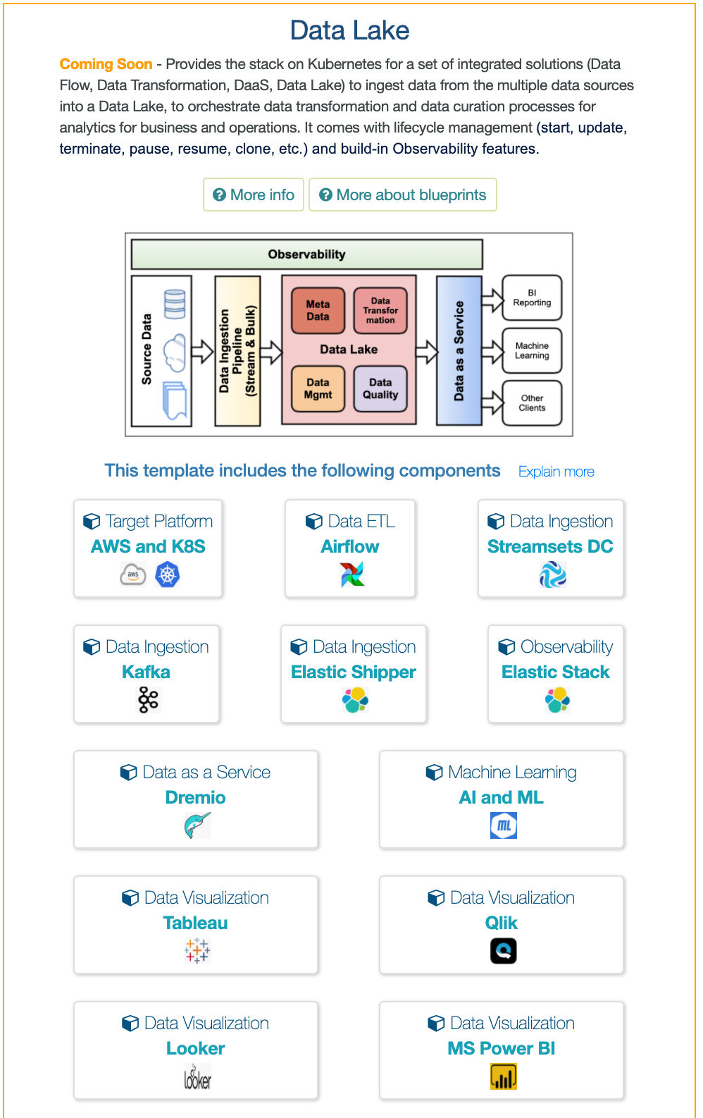 snapblocs provisions Data Lake Platforms following the well-architecture guides (i.e., AWS Well-Architected for AWS, Google Cloud Architecture Framework, etc.) for provisioning, configuring production-grade Kubernetes clusters and deploying workloads into the clusters. It provides benefits from patterns that have been used successfully for many customers in production environments. Also, snapblocs makes it easy to get started and easy to configure properly. Kubernetes is an open-source container-orchestration system for automating application deployment, scaling, and management. It is used to deploy selected Components. Kafka is used to building real-time data pipelines and streaming applications by integrating data from multiple sources and locations into a single, central Event Streaming Platform. Elastic is used to provide observability (monitoring, alerting, APM) for answering questions about what's happening inside the system by observing the outside of the system. Grafana is used to build visualizations and analytics to query, visualize, explore metrics, and set alerts for quickly identifying system problems to minimize disruption to services. StreamSets Data Collector is a low-latency ingest infrastructure tool used to create continuous data ingest pipelines using a drag and drop UI within an integrated development environment (IDE). It is used to ingest source data in-stream or batch to other data platforms such as Data Lake, on-prem, or cloud datacenter.